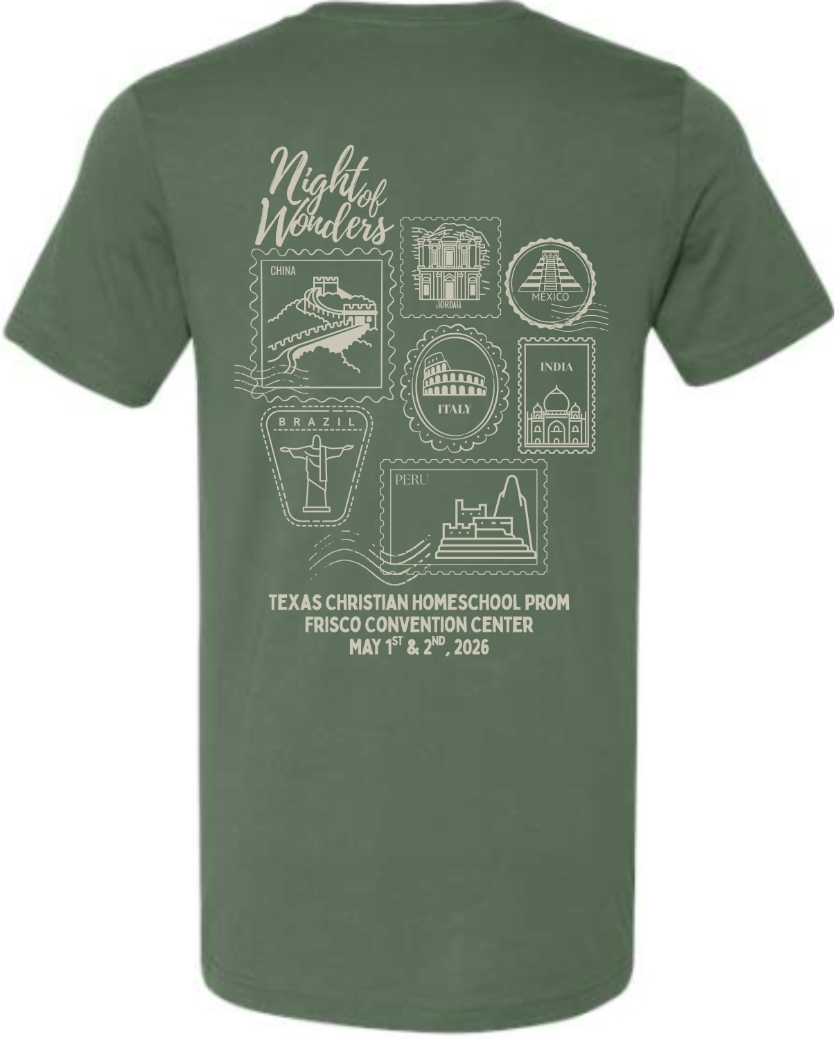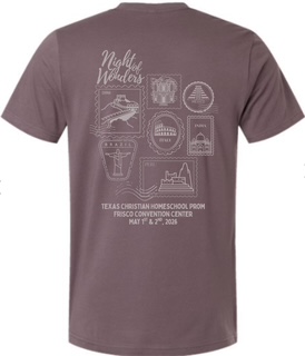This lightweight t-shirt on a light gray Bella+Canvas t-shirt with black ink has the prom logo, disco ball, and the year on the front shirt pocket design. The back celebrates the history of TxCHP with a concert tour style design with the themes and years across the back. Shirts are available for purchase in the Prom Store. Shirts will be available from the time ticket sales open until January 31st. Once shirt sales close, the shirts will be ordered in batch, then packaged and shipped to the home address from your prom account. Parent volunteers do the sorting and packaging at one or two of their workdays in February. You should receive your shirt order before dance lessons begin so you can wear it to the dance lessons. T-shirt prices include the cost of packaging and shipping them to you.